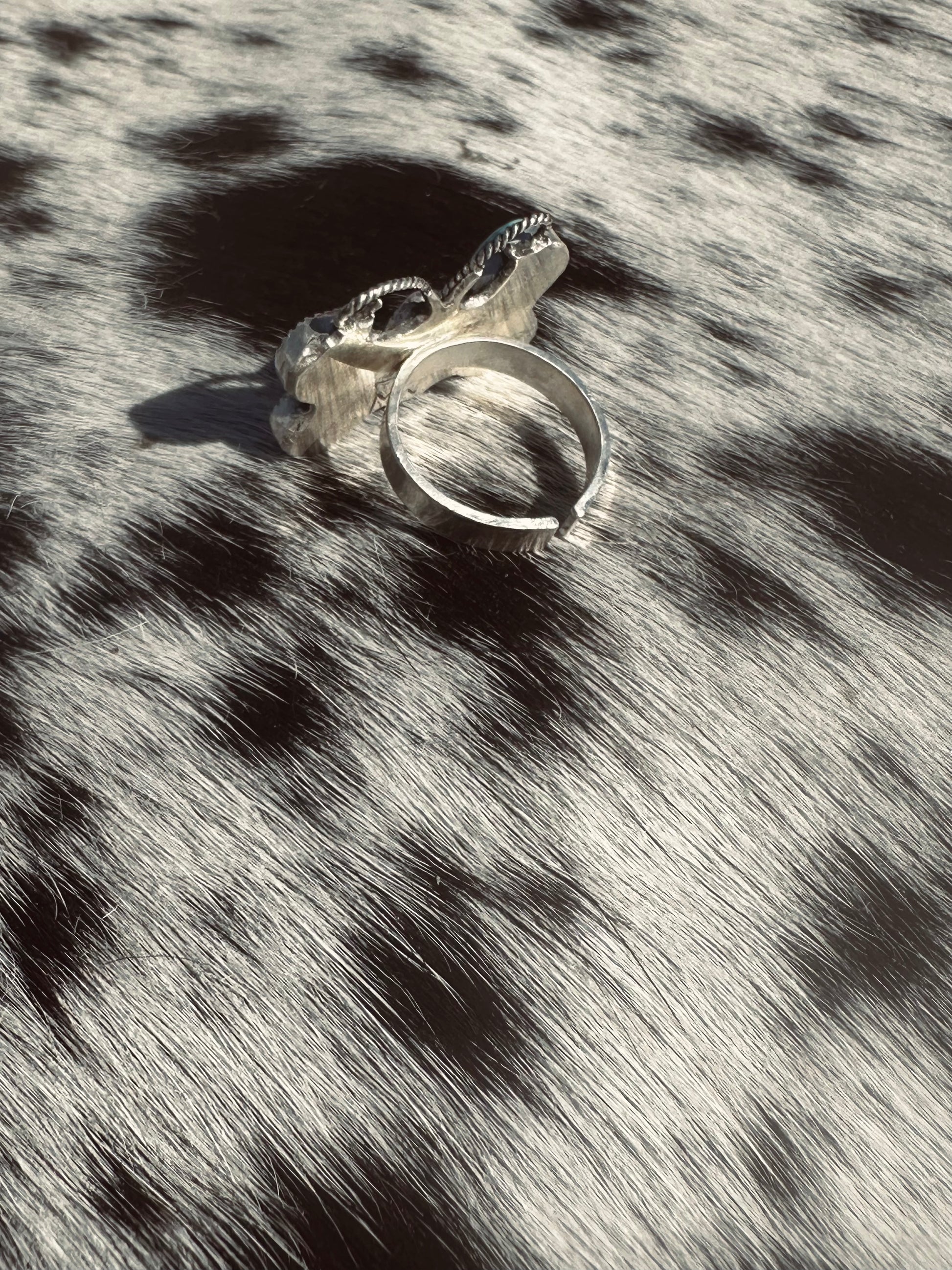 This butterfly ring features genuine Kingman turquoise paired with soft pink conch shell in a handcrafted cluster design. A feminine western statement piece that blends timeless southwestern craftsmanship with everyday wear.